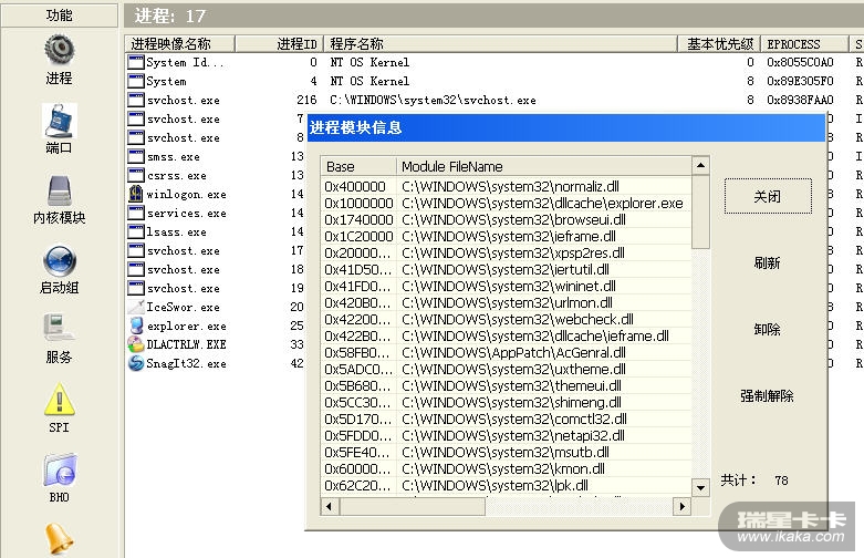 3、一一检查不能结束的那些进程中是否有病毒模块,若有,则强制卸除之。