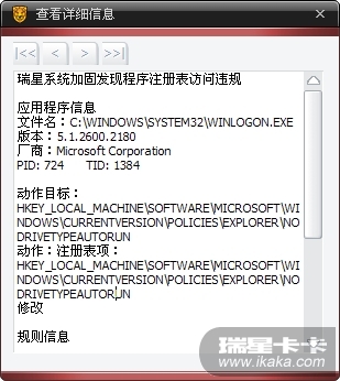 最近每次开机都“瑞星系统加固发现程序注册表访问违规”