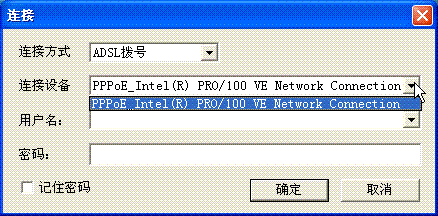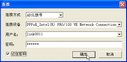 下方填入你的ISP,即网络运营商提供给你的帐号(用户名)和密码,并点击“确定按纽”。你可以勾选“记住密码”框,以后就不用每次都输入密码了,如下图: