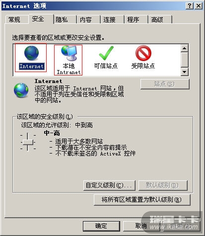 请您检查一下IE的internet选项中,安全选项卡下的internet和本地intranet是否为默认级别?