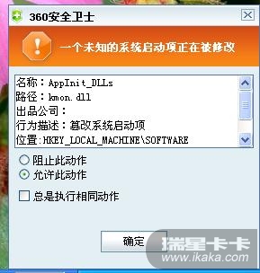 正常现象,卡卡6.0会修改注册表值AppInit_DLLs,请不用担心,不是病毒,允许此动作即可