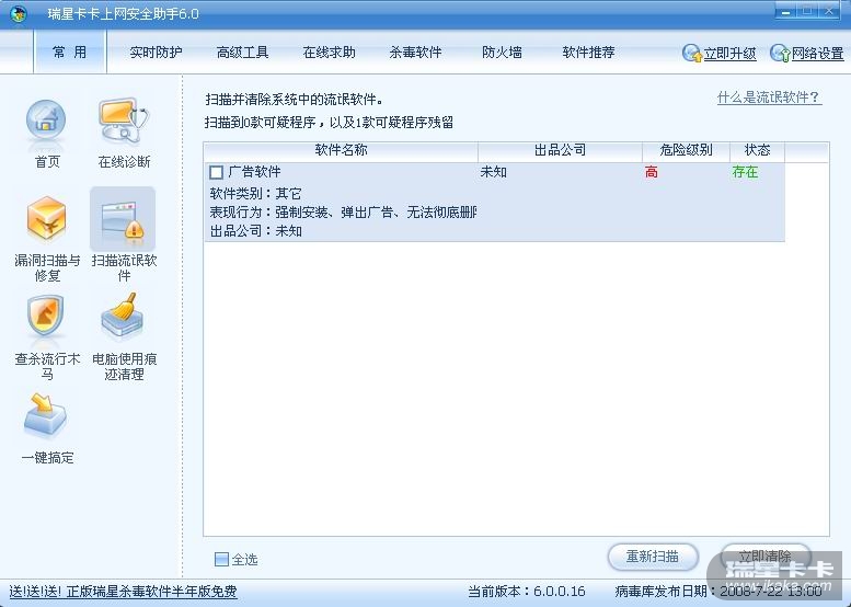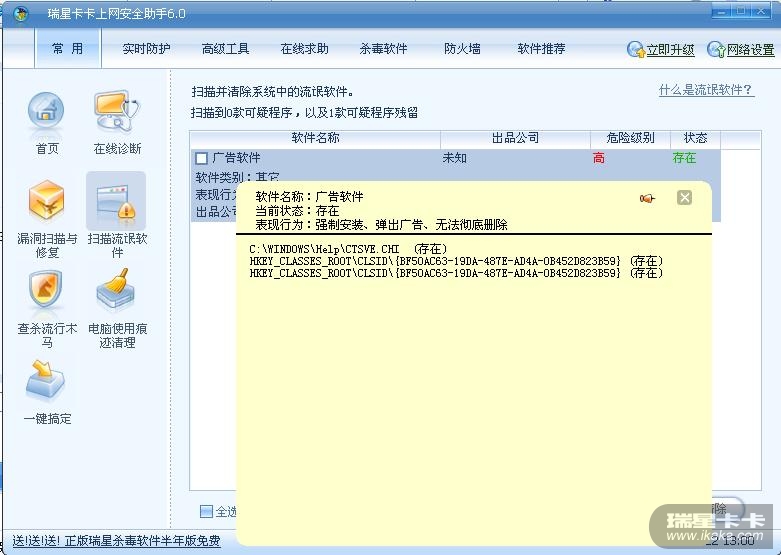 我的卡卡是最新的,用的是最新的瑞星杀毒,可是为什么就去不掉这个流氓软件。还且,只要点清除,就会计算机重起。郁闷啊~~