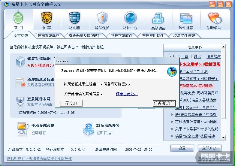 先升级瑞星杀一下毒,再卸载重装卡卡试试