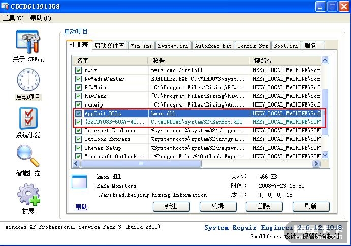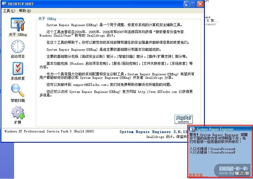 今天又用system repair engineer 2.6 正式版扫描了一下系统,出现了附件中的两个图。所以想问一下,卡卡难道也用了一些非常手段?