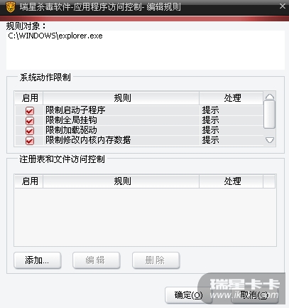 我按照周五清新阳光老师讲的设置编辑规则,即选用规则对象为explorer.exe,并启用四项规则,处理为“提示“,设置完成后,当我打开记事本文件时,瑞星却并未给出提示,