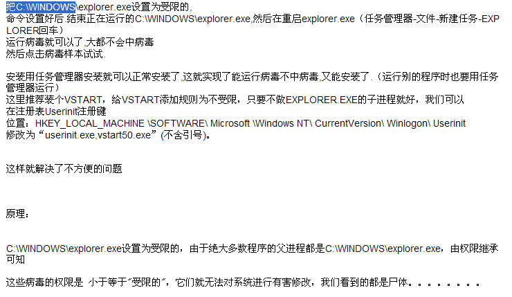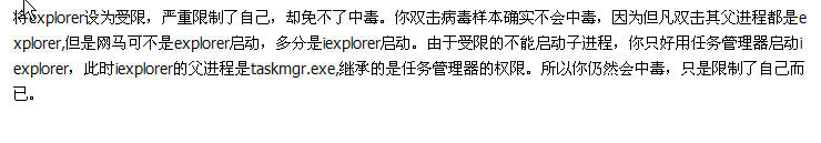 将explorer设为受限,严重限制了自己,却免不了中毒。你双击病毒样本确实不会中毒,因为但凡双击其父进程都是explorer,但是网马可不是explorer启动,多分是iexplorer启动。由于受限的不能启动子进程,你只好用任务管理器启动iexplorer,此时iexplorer的父进程是taskmgr.exe,继承的是任务管理器的权限。所以你仍然会中毒,只是限制了自己而已。