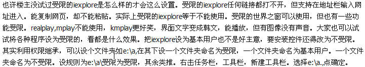 也许楼主没试过受限的iexplore是怎么样的才会这么设置。受限的iexplore任何链接都打不开,但支持在地址栏输入网址进入。能复制网页,却不能粘贴。实际上受限的iexplore等于不能使用。受限的世界之窗可以使用,但也有一些功能受限。realplay,mplay不能使用,kmplay更好笑,界面文字变成韩文,能播放,但有图像没有声音。大家也可以试试将各种程序设为受限的,看都是什么效果。把iexplore设为基本用户也不是好主意,要安装控件还得改为不受限。其实利用权限继承,可以设个文件夹如e:\a,在其下设一个文件夹命名为受限,一个文件夹命名为基本用户。一个文件夹命名为不受限。设规则为e:\a\受限为受限,其余类推。右击任务栏,工具栏,新建工具栏。选择e:\a.,点确定。