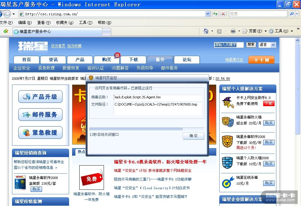 打开所有的网页,瑞星网页监控都提示网页含有病毒代码,包括瑞星官方网页,我贴几张图