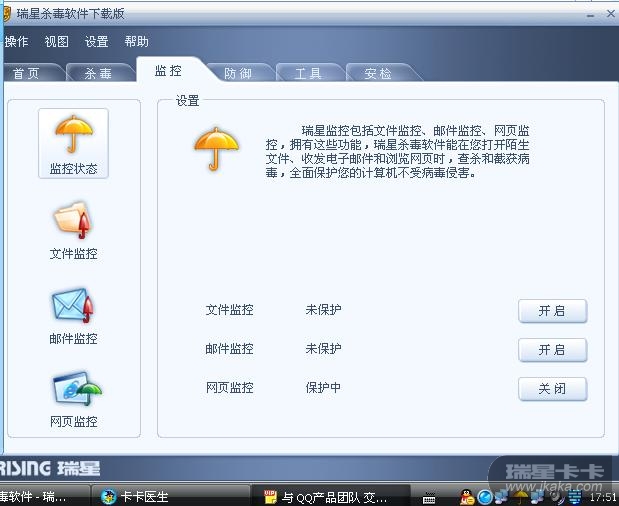 早上电脑还正常,下午开机,瑞星开机后出现黄伞,恶意行为检测、文件监控、邮件监控末开启,只有网页监控是开启的,进监控页面点开启没反映,点升级,升级时瑞星监控也不退出,升级完成后还是黄伞!用瑞星卡卡修复LSP无用,中毒可能行小!请求解决方法!