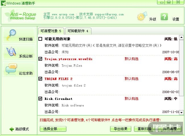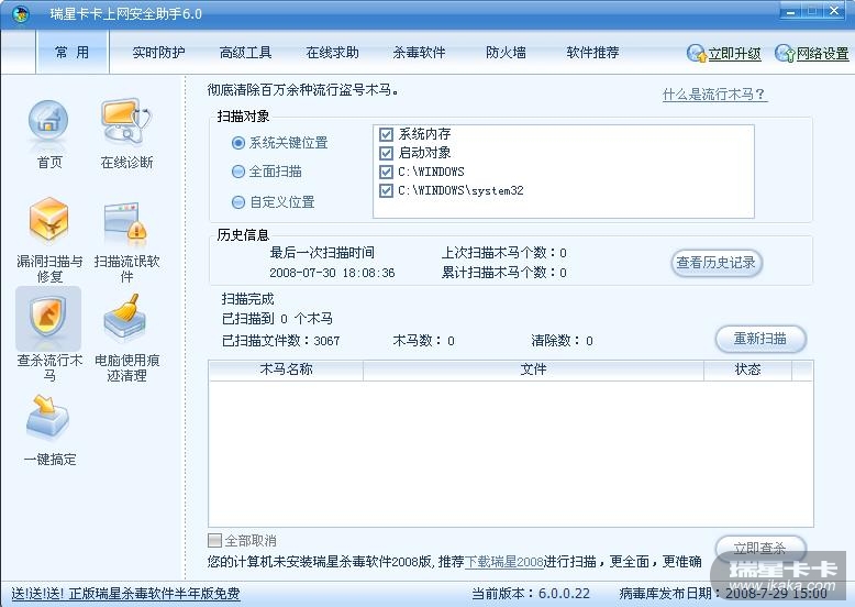其实我对安全软件特别感兴趣,像恶意软件清理助手啦,金山清理专家啦,瑞星卡卡啦,360啦,windows清理助手啦我都有,下面来看一看它们的实力吧!首先我用卡卡对系统进行了一次恶意软件+木马扫描+在线诊断,结果如下: