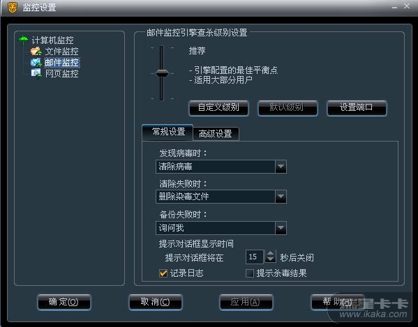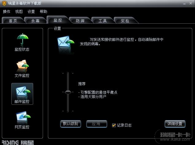 大部分杀毒软件都对磁盘中的文件进行实时监控,有些杀毒软件并不具备对邮件进行实时监控的功能,为此,必须为计算机安装一款对邮件实时监控能力非常强的杀毒软件。在邮件实时扫描方面,瑞星杀毒软件的表现还是非常不错的。杀毒软件的邮件扫描功能启用后,收发邮件过程中就可以对邮件内容及附件进行检查,这样可以有效防止“邮件病毒”的入侵。
