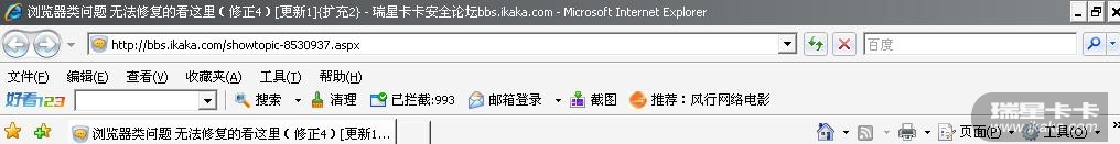 1.主页遭篡改,用卡卡上网安全助手检测IE说IE主页引用未知空白页,卡卡等修复了又反复。(被本人解答的楼主主页被更改的区别只是被改后显示的主页不同而已)