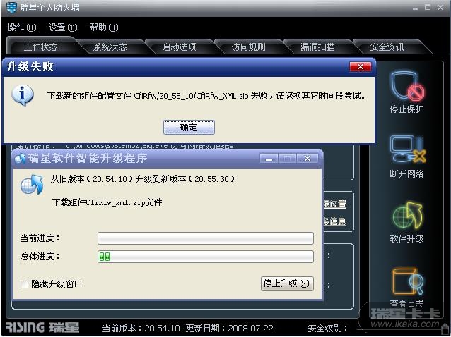 我杀毒软件升级时也是这样的提示,后来我把防火墙关掉后就能正常升级了。防火墙最后一次升级是7月22日,这几天每天在不同时段升级都是出现象上面的提示。