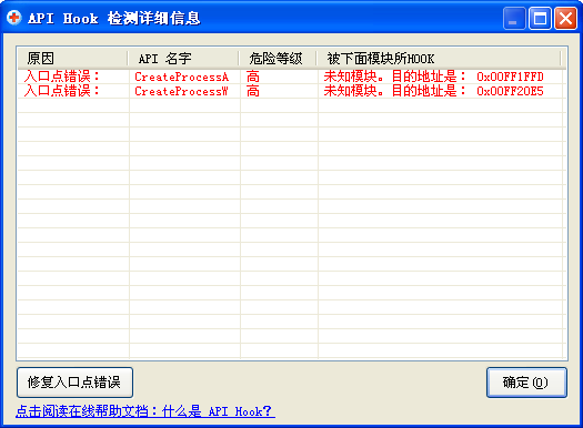 入口点错误:CreateProcessW (危险等级: 高, 被下面模块所HOOK: 0x00FF20E5)