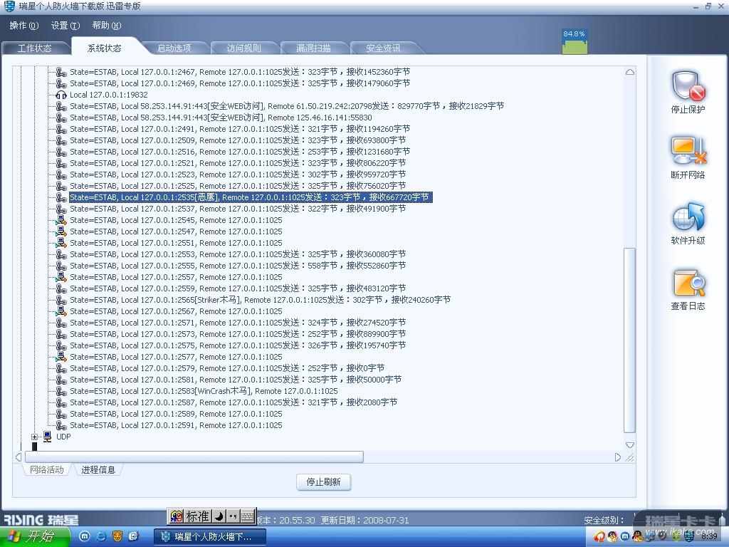 发现有一个ripper木马在发送数据,于是右键杀毒(本人用的是迅雷的半年免费正版,杀渡软件和防火墙都有)没有发现木马病毒。于是我想既然我旋风在下载东西,那应该打开很多端口,这个看似瑞星程序的东西怎么也打开那多端口呢?(姑且这样叫,因为我不知道它是不是瑞星的程序呢)点开旋风,看到下图2