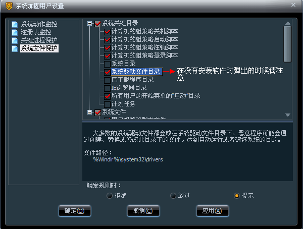 在主动防御中的系统加固用户设置中,对系统动作的监控中做如图所示的勾选;