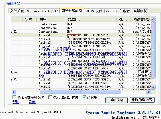2.删除重启后使用SREng修复下面各项:启动项目 -- 注册表之如下项删除: