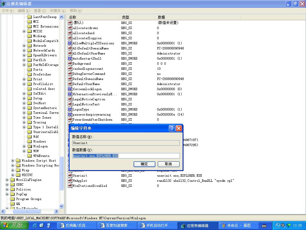 我打开后值为userinit.exe,EXPLORER.EXE。别人说把EXPLORER。EXE删除就可以了不过我一删除就提示为。 无法编辑 Userinit:写该值的新内容出错