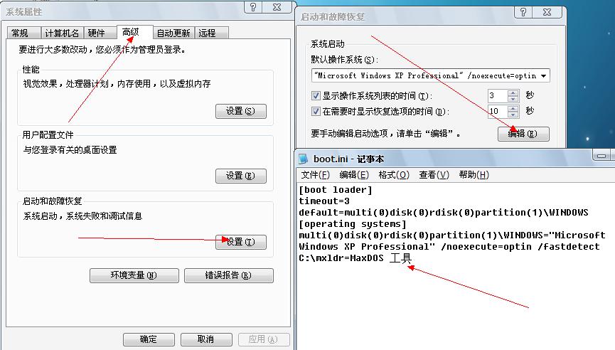 删去你的那个工具就可以了,别把XP删了。编辑完保存好,重启试试、如图,就应删去C:\mxldr=MaxDOS 工具 同理你的那个工具也这样删。