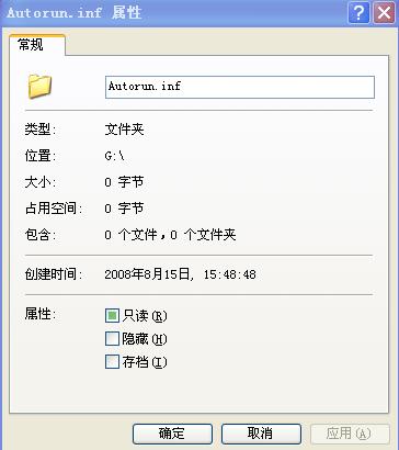 U盘插进电脑后,卡卡6对实行U盘免疫,随后,360也是.我也觉得奇怪的了,怎么今天卡卡6会对U 盘免疫.我用瑞星杀后,没有病毒.可是,U 盘多了一个Autorun.inf文件,没有内存.应该是灰鸽子吧,我马上用瑞星粉碎器把他粉碎了,可再一次插入电脑,它又出现了.怎么办?是不是灰鸽子?