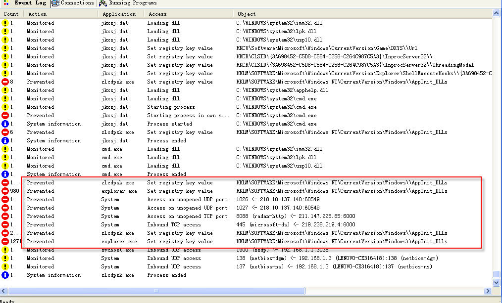 查看Tiny的activity monitor日志(图1),病毒正在傻傻的写AppInit_DLLs,但总写不成。