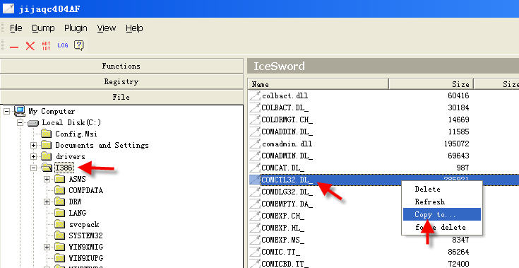 乘机用IceSword将I386目录下的taskmger.exe、debug.exe和comctl32.dll分别拷贝到dllcache和system32目录下(图2、图3)。