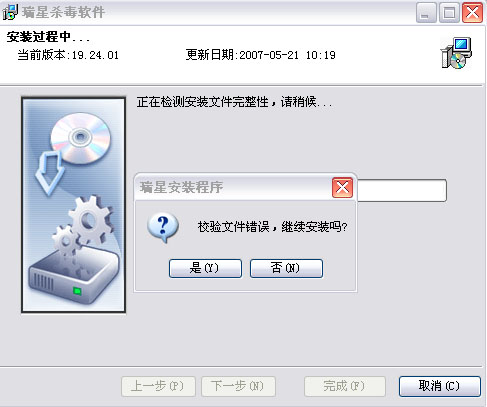 电脑中毒拉,重新装了系统,但是瑞星却装不上了,我的是正版的,装的时候出现-----校验文件错误,继续安装吗?