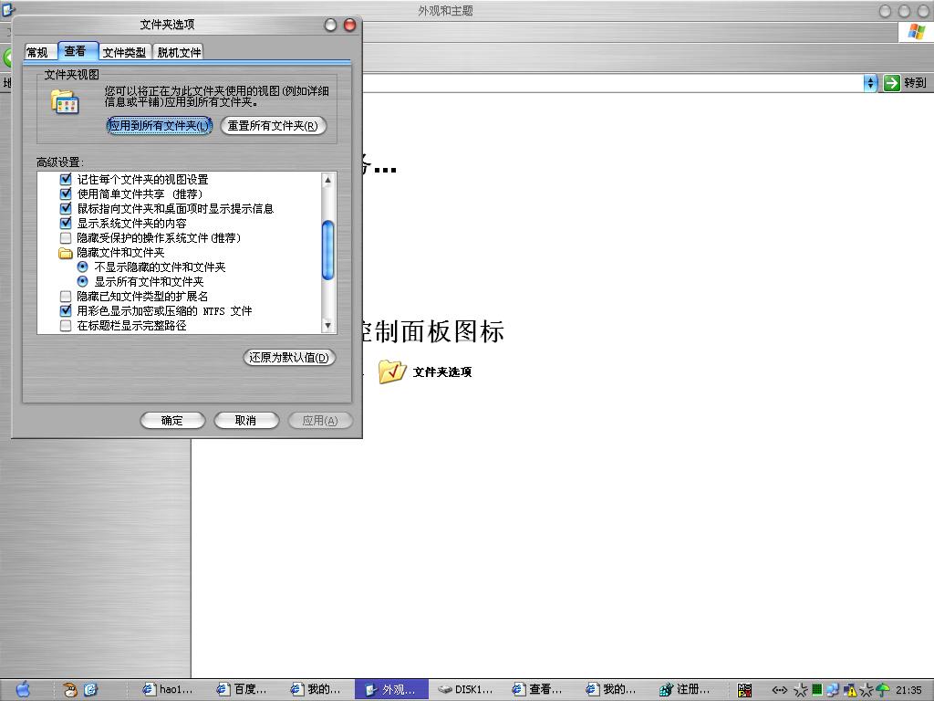 4.打开文件夹选项--查看--·显示隐藏的操作系统文件和文件夹·,显示所有文件和文件夹,然后确定,右击硬盘,选下面的·打开·,千万不要双击,否则病毒自动运行。此时你就能看到你原来的文件了,然后删除autorun.inf以及一个.exe的病毒文件,每个硬盘根目录下面都有。