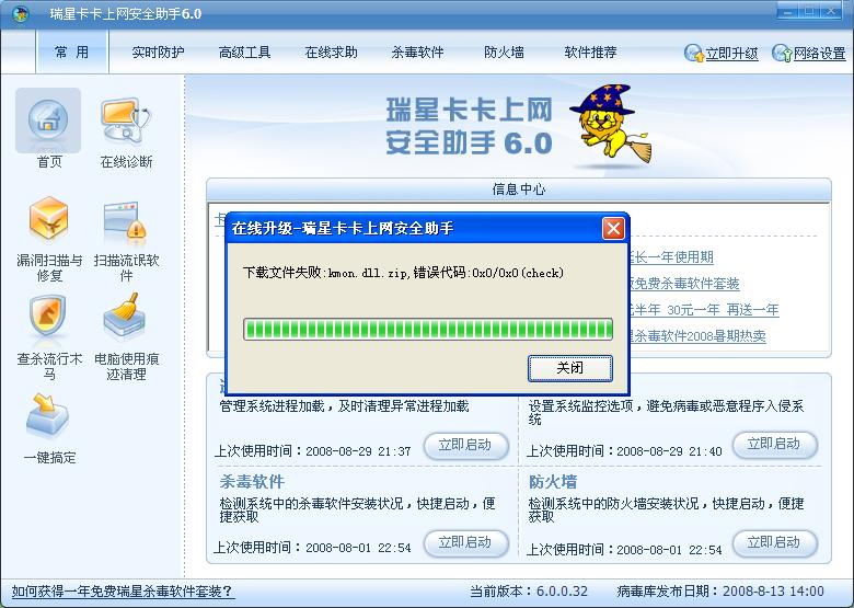 我的卡卡6.0近一个月了,都无法自动升级,每次总是显示下载,然后到哪个文件就停住了,我上传了截屏,请瑞星工程师帮助解决!如果系卡卡自身问题,建议尽快升级为好!