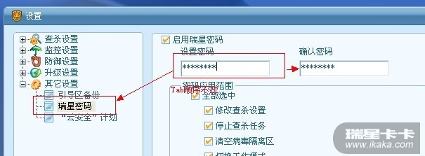 浏览器及版本:IE7 瑞星软件版本:21.00 涉及的其它软件版本: 问题现象:如题,比如此图的界面,输入设置密码后按Tab键本应该跳到确认密码上的,但是却跳到了“瑞星密码”上,此类Tab键序问题还多处存在。