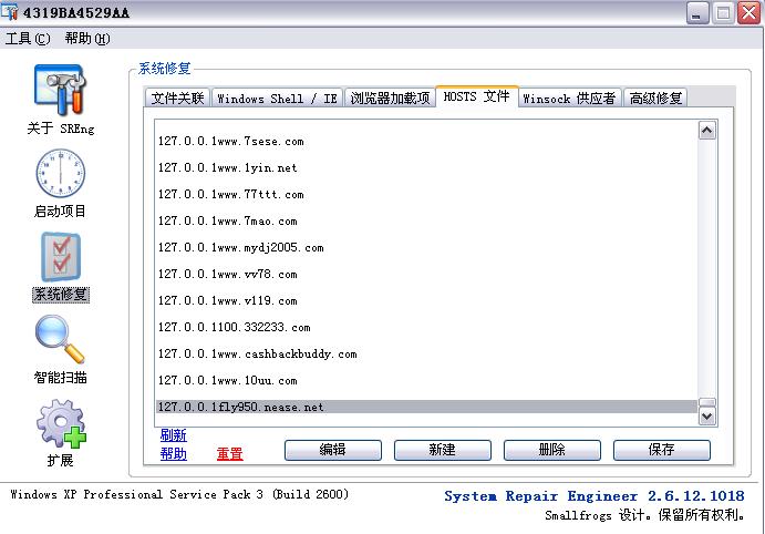 如果你嫌上述手工方法太笨拙,你也可以通过专门的工具来达到目的。sreng2(下载见附件)就可以让你轻松地修复Hosts表文件了: