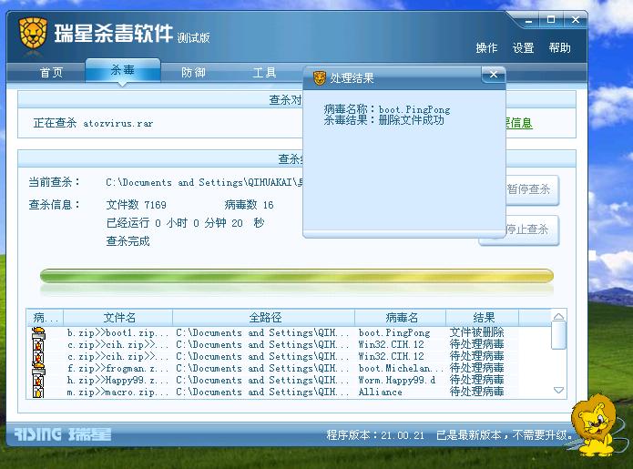 09测试版的病毒库不是最新的,所以会有查杀病毒数量减少的情况。结果显示为“待处理病毒”,杀毒结束后会弹出提示最终处理状态。