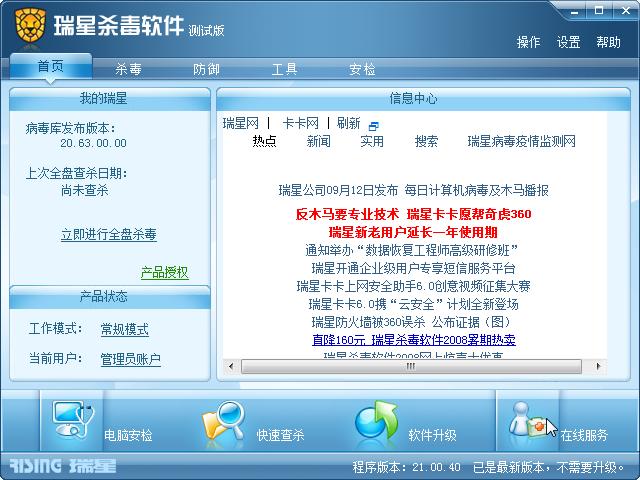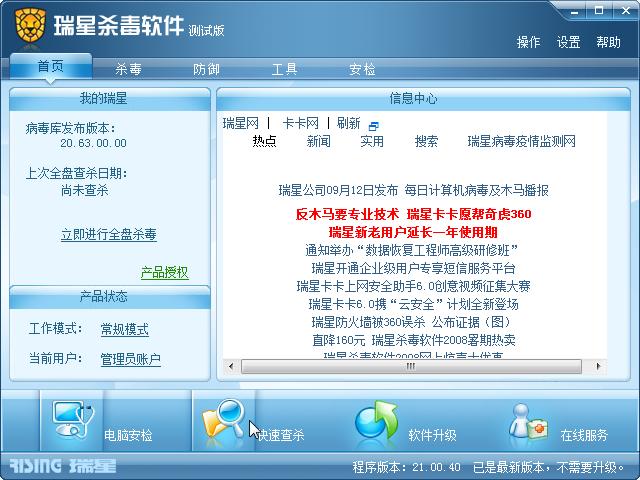 瑞星界面还是存在问题,不管哪种状态电脑安全检测一直突起
