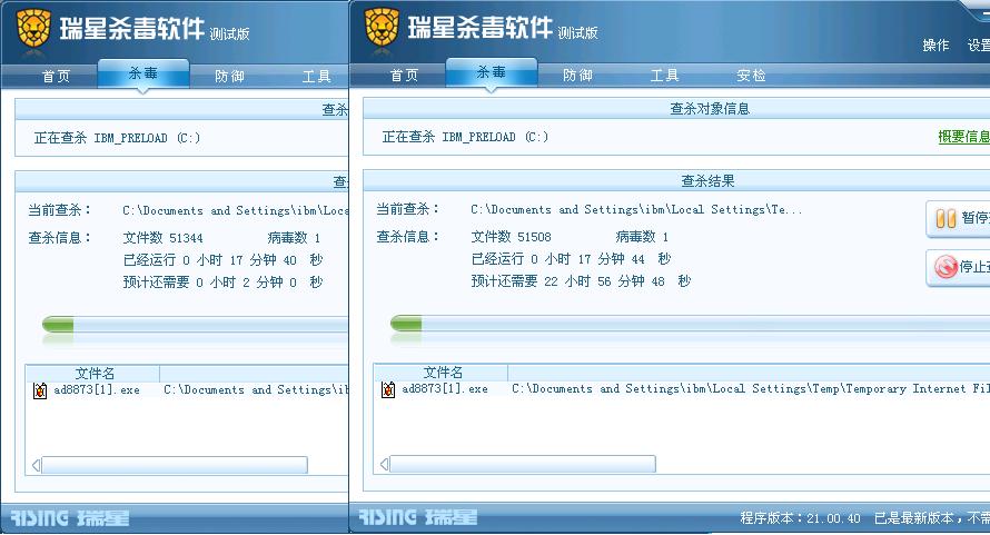 出现问题前的操作步骤:1.点击杀毒,查看估算时间如图,一个是2分钟,4秒之后变成22小时,并且这个还在不停的在2分钟到22小时之间变化