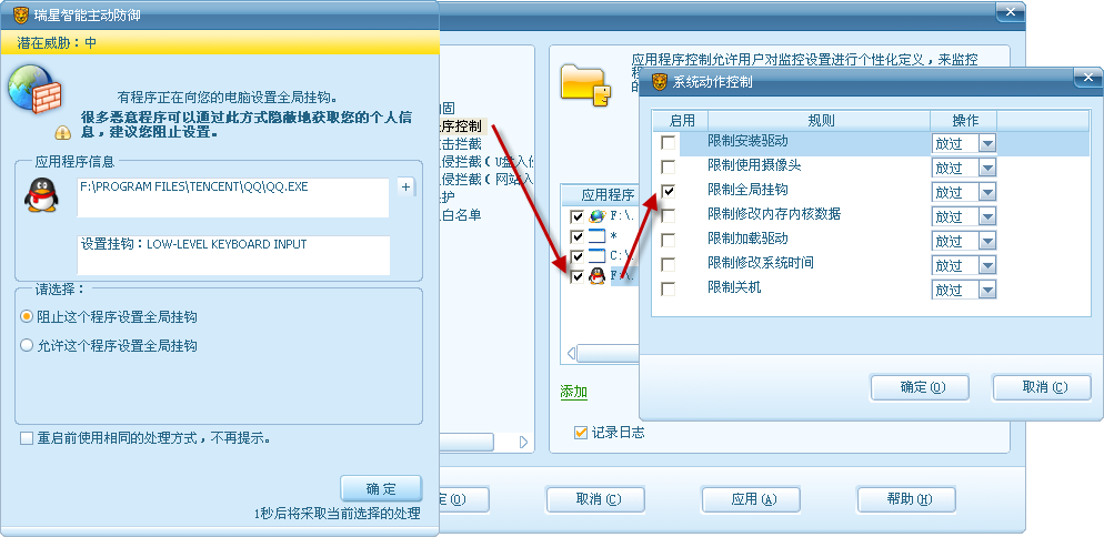 问题现象:在防御设置里的“系统加固”勾选了“挂全局钩子”。又在“应用程序控制”里添加了允许QQ挂钩子的规则,但启动QQ还是出现提示。