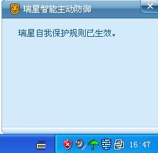首先是没有了08的进程提示,用户不知道是哪个进程在访问瑞星。再则,语言不够人性化。“自我保护规则已生效”建议修改为“瑞星提醒您,某某进程试图修改瑞星,自我保护已将其拦截!”这样的语句更加温馨,也易明白。