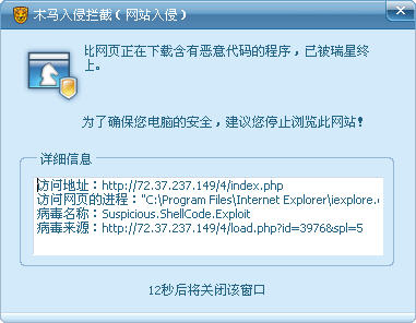 测试要求:杀毒软件保持最新版,打开网站入侵拦截,使用IE核心浏览器访问挂马网站