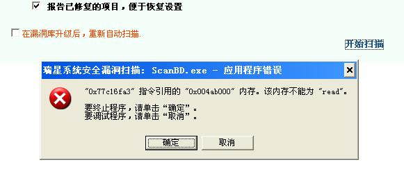 为什么我的瑞星防火墙扫描漏洞时会出现内存错误?