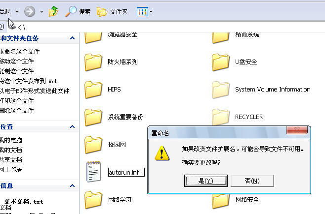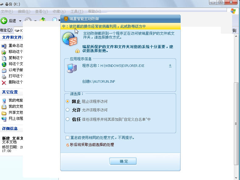 问题现象:在D盘下创建个AUTORUN.INF文件,主动防御提示了,我不做任何操作,让他按默认操作,最后还是成功创建了AUTORUN.INF文件