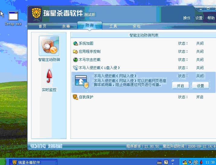 3.网页防御问题,测试中发现瑞星的网页入侵防御不是能够100%防住所有类型的挂马,需要加强。