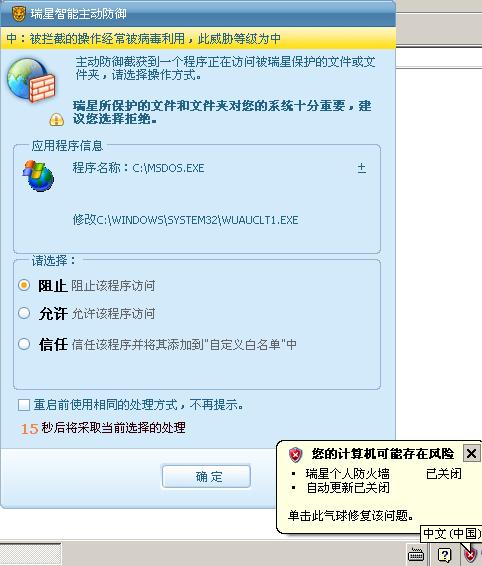 瑞星杀毒软件并没有被破坏。但是防火墙就不能幸免了。防火墙的自我保护需要加强!