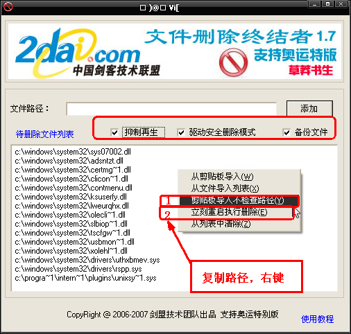 引用aaccbbdd的说明:先勾选抑制再生,删除时复制所有要删除文件的路径,在待删除文件列表里点击右键选择从剪贴板导入不检查路径,