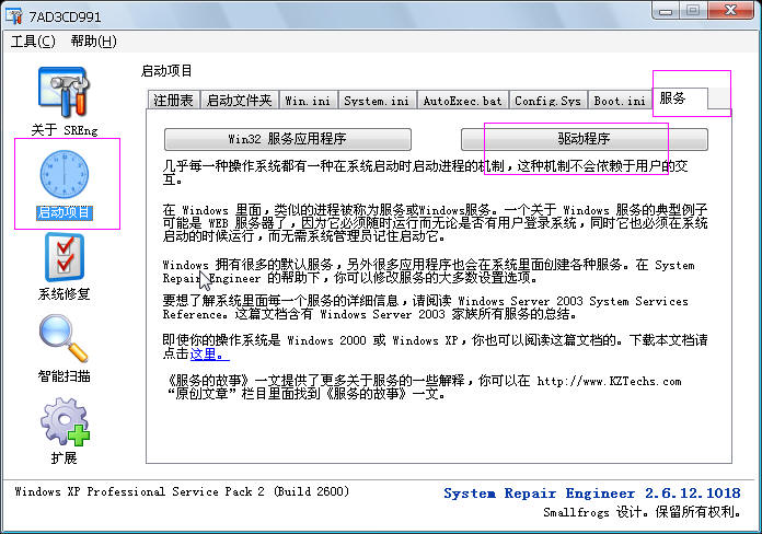重启后,点 SRENG-启动项目 -- 服务-- 驱动程序之如下项删除:(选中有问题的驱动/服务后,点"删除服务",点"设置"按钮即可。注意弹出的窗口中要点"否NO"才是确认删除服务)