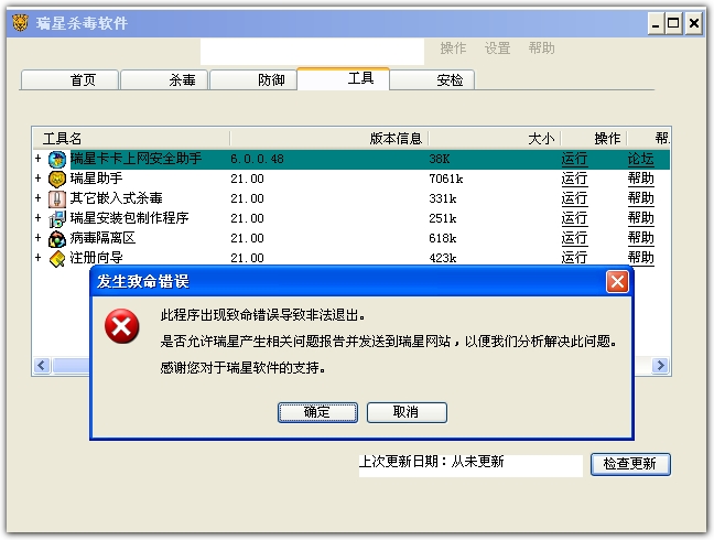 瑞星软件版本:20.63.06.00,由于无法升级,病毒库只能是这个版本.