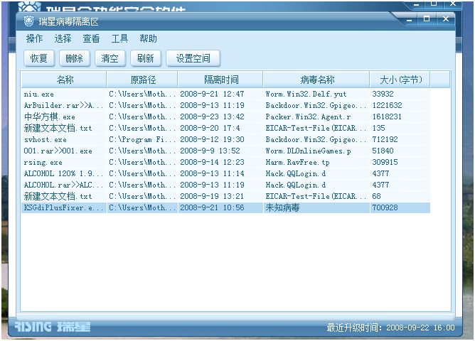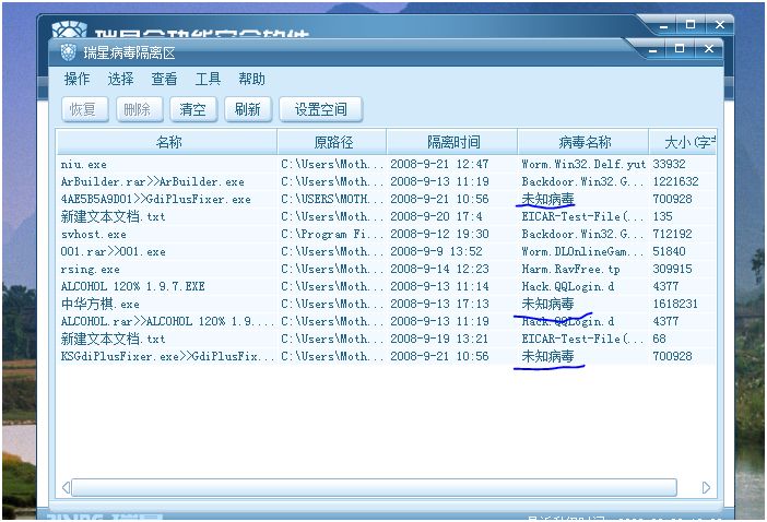 我恢复其中一个文件 后瑞星 立刻报毒 再看隔离区 病毒名被报出了