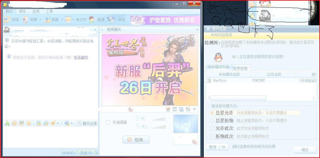 今天我在本机登陆了2个QQ  想测试一下瑞星对摄像头的反映结果出现了很悲壮的而一个场景