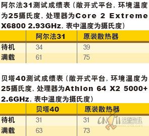 我们搭建了以Core 2 Extreme X6800和Athlon 64 X2 5000+为主的LGA 775平台与Socket AM2平台,分别对阿尔法31和贝塔40进行了测试。经测试,滚压工艺技术的确能有效地提高散热器的散热性能,两款散热器的散热效果都很不错,明显好于原装散热器,特别是在处理器满载状态下。另外给我们印象很深的是,两款散热器都比较安静。