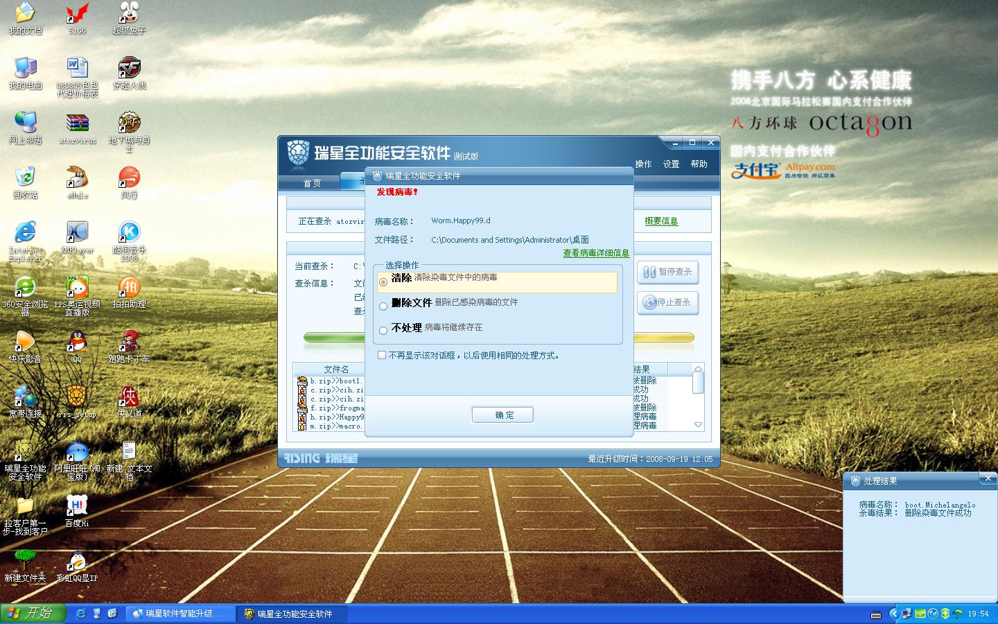 我选择了删除已染毒文件  但是没有把病毒包删了  还是会弹出提示框  最后是我自己删了病毒包  才没有弹出提示框的