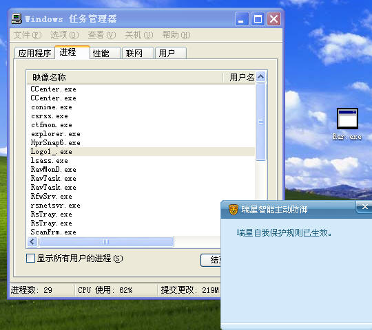 4. 运行该样本。未发现瑞星有任何动静。只是过了一段时间后弹出了瑞星自我保护的提示,因为病毒正在试图感染瑞星文件夹中的文件。