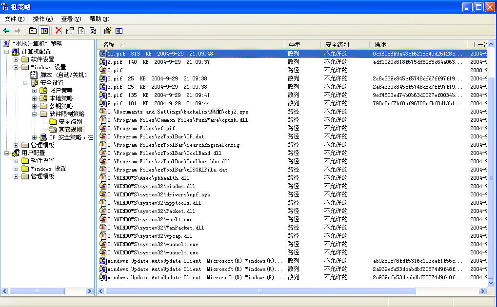 设置好上图所示的"软件限制策略"后,重启。删除病毒文件。如果那个3.pif删不掉,用IceSword宰它(因IFEO劫持IceSword不能直接运行-----可以改名运行)。